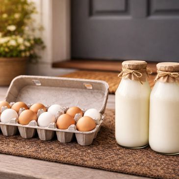 A half gallon (or more) of farm fresh milk and a dozen (or more) farm fresh eggs delivered to your door at any frequency you prefer.
